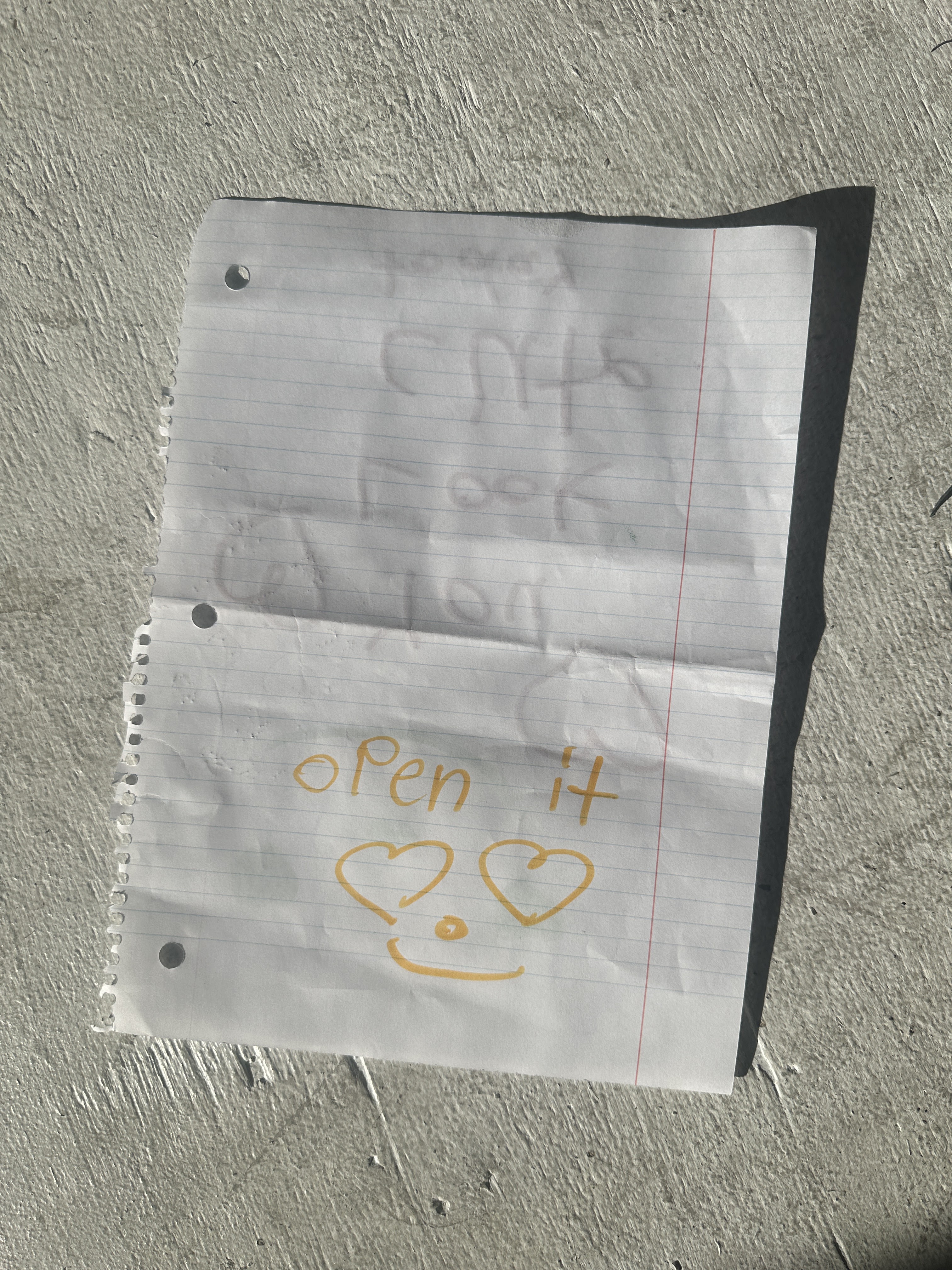 Children’s Drawings (“Open it”, “Hi!!!”, “You look cute today”, and “You are fat”)